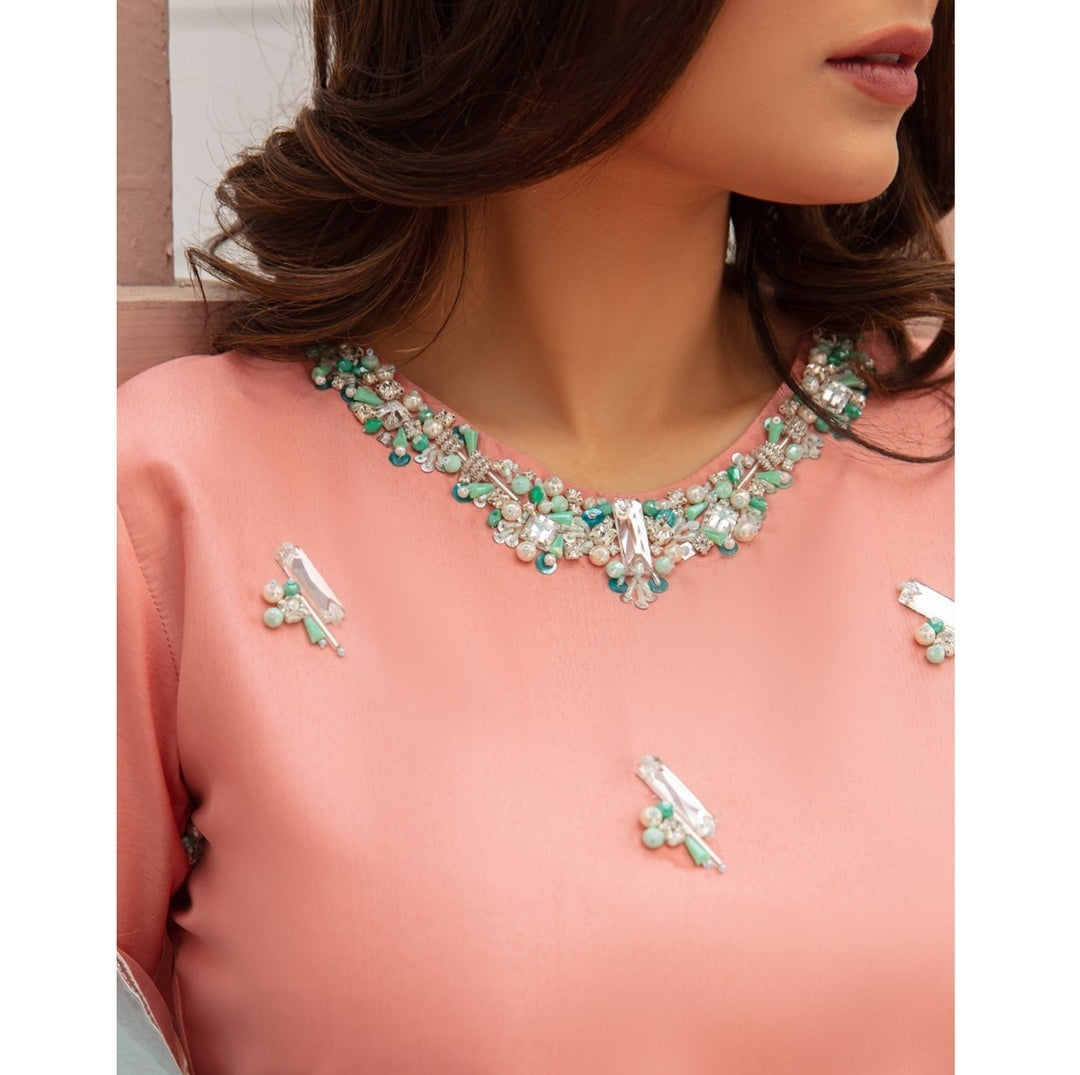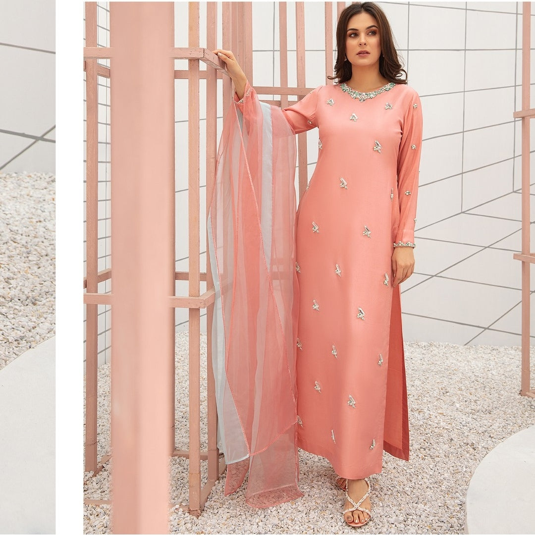 Introducing our exquisite Unstitch Silk Dress with Crystal and Pearl Handwork – a luxurious masterpiece. Crafted from premium silk, this dress dazzles with intricate handwork on the neck and front. Paired with a plain Organza Dupatta and matching Silk Trouser, it’s a timeless choice for elegance and sophistication. Elevate your style effortlessly with this stunning ensemble.